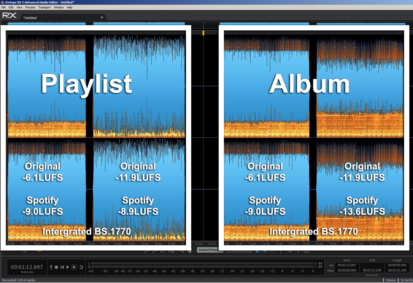 I made an album with three versions of the same song. The masters are pretty much the same except that they have different loudness targets. The tracks are named with the original files LUFS value, the True Peak value (dBTP) and the Sample Peak value (dBFS). After uploading it to Spotify I created a playlist with just the quietest and the loudest version (if I included all three Spotify handled it as an album play). I played the same part of the track from the Playlist followed by the Album version and measured it all with IzotopeRX and here’s the result.